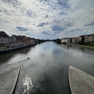 Etter å ha satt opp campen, tok vi syklene fatt og syklet langs den vakre stien ved Donau-elven inn til byen. Regensburgs naturskjønne elvebredder er perfekte for en sykkeltur, og stien ga oss en flott utsikt langs elvebredden.